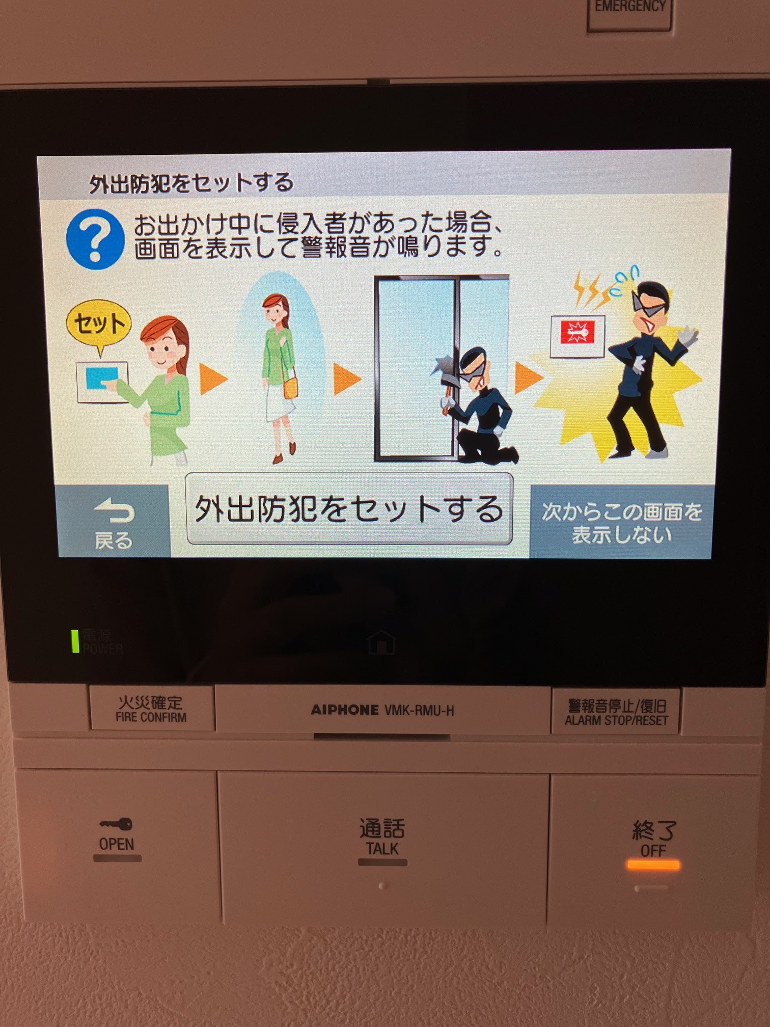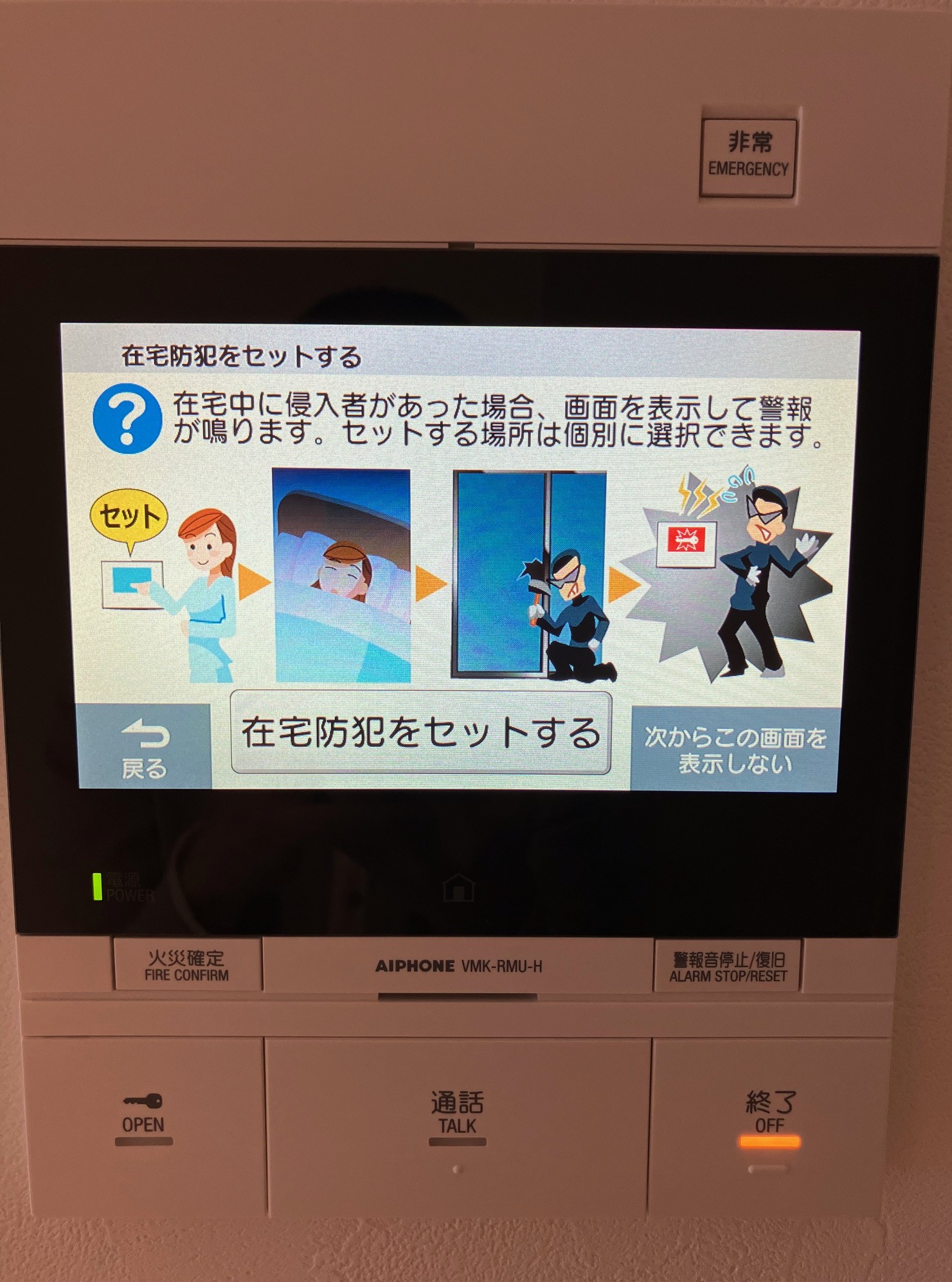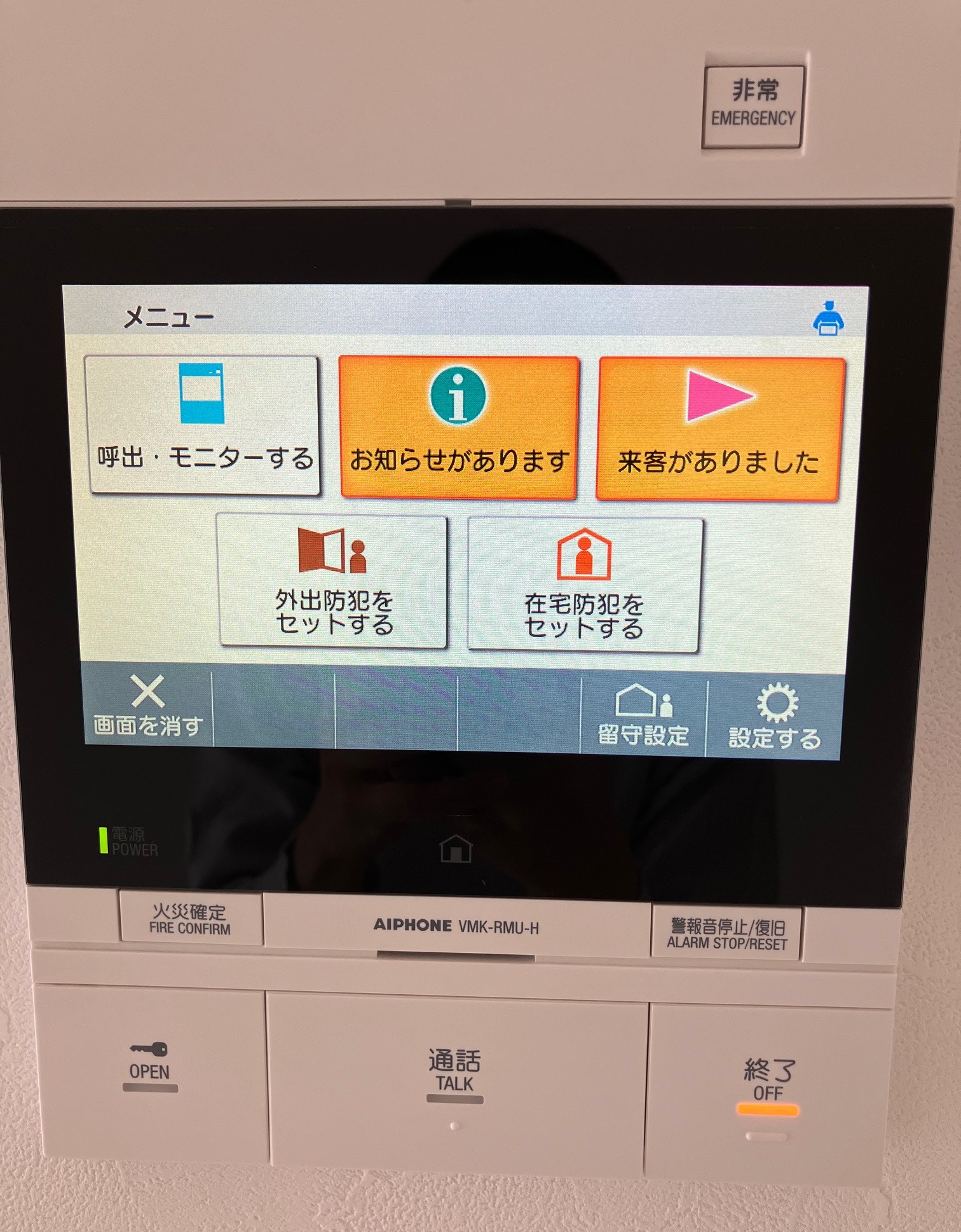 お部屋のキッチン脇のモニターで、1階エントランスに来た訪問者を確認し、開錠操作を行うのですが、このモニター内に、セコムのセキュリティシステムが入っています。