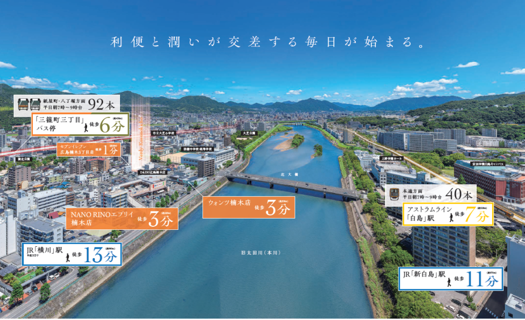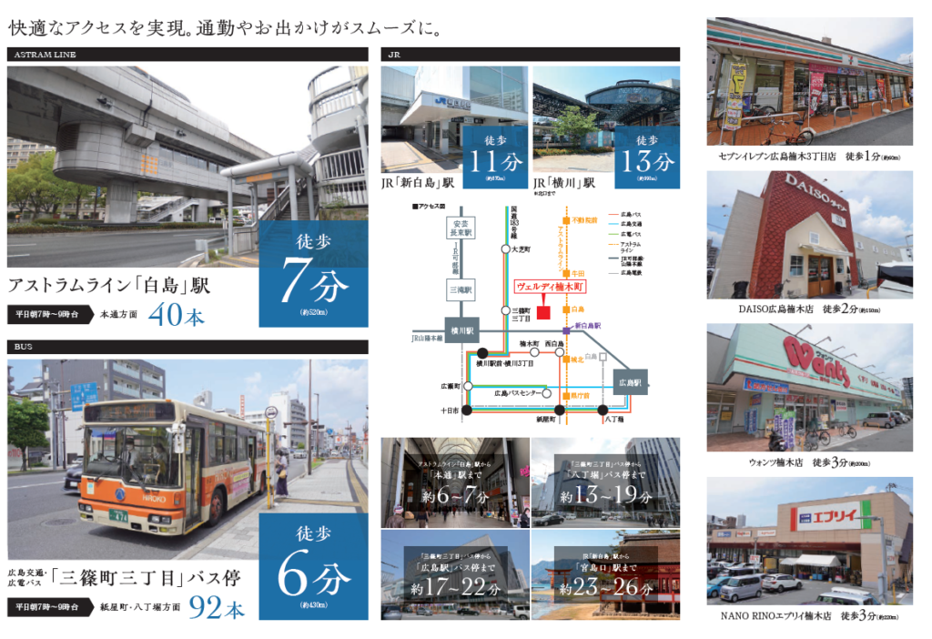本物件は、アストラムライン白島駅へ徒歩7分、JR新白島駅まで徒歩11分の立地に誕生いたします。