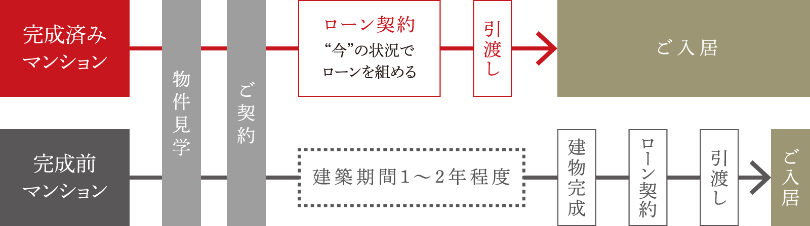 ↑ ↑ ↑ ↑ ↑ ↑ この図のように、これから建てるマンションの場合は おそらく少なくても1年から2年は マンションの工事が完了するのをじっと待つしかないので……… もし、完成物件を気に入って契約すれば その1~2年分の家賃も節約できるのです。